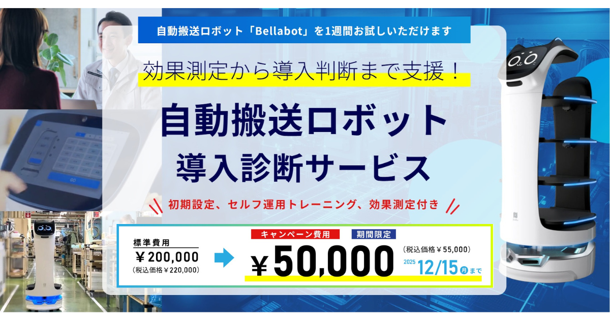 株式会社アフレル(福井県福井市、代表取締役 共同CEO 小林靖英、以降「アフレル」)は、工場や倉庫への自動搬送ロボット導入を検討している企業向けに、「自動搬送ロボット導入診断サービス」を提供開始します。本サービスは、ネコ型自動搬送ロボット「BellaBot」の一週間貸出に加え、利用施設での初期設定やセルフ運用トレーニング、現場運用後の効果測定を実施いたします。
